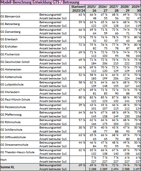Wichtige Zukunftsthemen für die Primarstufe sind die Inklusion sowie die Betreuungsangebote. Im Rahmen der Schulentwicklungsplanung sprechen wir mit Ihnen ab, welche Ansätze Sie als Schulträger bislang verfolgt haben. Wir beraten Sie im Hinblick auf mögliche Wege für die Zukunft und die Umsetzung des Rechtsanspruchs auf Ganztagsbetreuung in der Grundschule. Beispiel Tabelle links: im SEP der Stadt Kaiserslautern wurden für die Folgejahre je Standort Zielwerte definiert, die sich an den Ausgangswerten orientieren und berücksichtigen, ob sich einer der Horte im Einzugsbereich befindet. Je nach Standort ergeben sich daher Zielwerte zwischen 50 und 90 Prozent. Die Vorgehensweise bei der Berechnung der möglichen zukünftigen "Betreuunskinder" unterscheidet sich je nach Schulträger und wird jeweils individuell abgestimmt. |