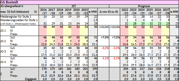 Wanderungsbewegungen zwischen Schulstandorten in den Vorjahren Veränderungen in aufsteigenden Klassen Beispiel Diagramm rechts: GS Bustedt aus dem SEP der Stadt Bünde (NRW). Der Einzugsbereich der Schule ist relativ klein, im Melderegister sind deutlich weniger Kinder verzeichnet als wir in Jahrgangsstufe 1 vorfinden. Der Abgleich von Jahrgangsstufe 1 und Melderegister ergibt ein Plus von 122,8 Prozent. Die Schule ist jedoch nur für acht Klassen ausgelegt und nimmt aufgrund des inklusiven Arbeitens maximal 52 SuS auf. Dies haben wir in der Prognose bereits berücksichtigt, und in den Jahren die Gewinne gegenüber dem Melderegister so angepasst, dass die Schule jeweils voll ausgelastet ist, aber nicht mehr als 2 Züge bildet. Die Anzahl der SuS verändert sich zudem zwischen Einschulung und Verlassen der Schule: so sind im Beispiel in Jahrgangsstufe 2 im Schnitt 7,0 Prozent mehr Kinder vorhanden als in Jahrgangsstufe 1 des Vorjahres: ein typisches Kennzeichen von Schulen, in denen Kinder die Schuleingangsphase in drei statt zwei Jahren durchlaufen, oder von Einzugsbereichen mit hoher unterjähriger Wanderungsdynamik. In Jahrgangsstufe 3 und 4 hingegen zeigen sich dann leicht negative Effekte. |